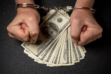 Man s hands in handcuffs and many hundred dollar american banknotes on black background. The concept of corruption, robbery, fraud