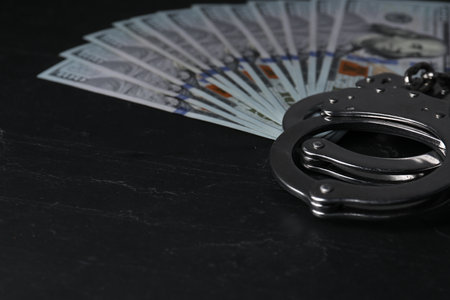Corruption. Handcuffs and dollar banknotes on black table, closeup