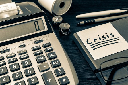 Word crisis chalk hand drawn on blackboard and calculator