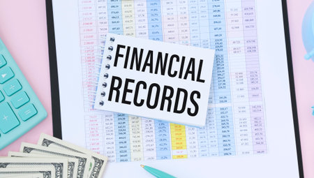 A Financial Records sheet with a calculator and a pen on it. The sheet is filled with numbers and calculations