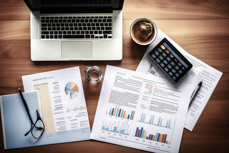 An overhead shot of a desk cluttered with financial reports and a laptop displaying a detailed business graph, capturing the essence of analysis and productivity in the workplace.