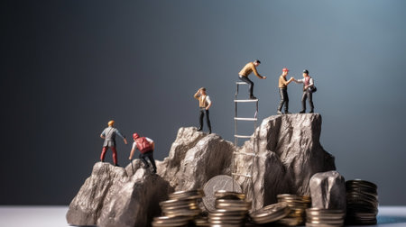 Miniature people. Climbers are climbing coins. Success business concept. business concept. Generative AI