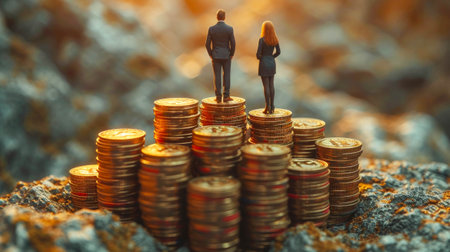 Rear view of businessman and businesswoman standing on a pile of coins against the background of a beautiful sunset.