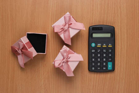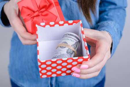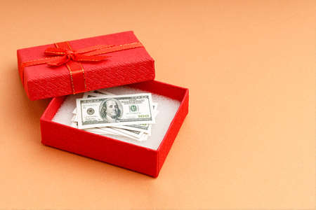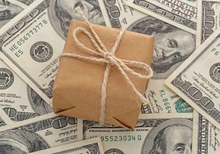 Box with a gift on the background of money studio image. Money dollars with Christmas gift concept of spending on gifts.