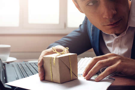 man businessman in suit corrupt official accepts a bribe in the guise of a gift. the concept of corruption and bribery