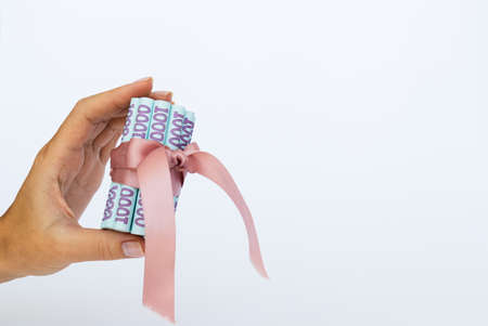 Female hand giving Ukrainian banknotes in rolls tied with a gift ribbon.