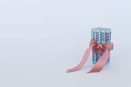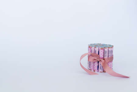 Money gift. Ukrainian hryvnia in rolls with a gift ribbon. Copy space.