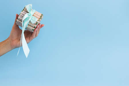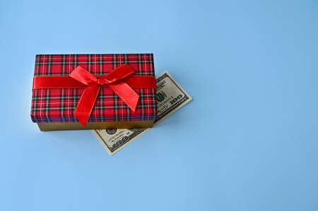 gift box tied with red ribbon with bow lies on $ 100 bill on blue background. Buying gifts for holiday. Monetary gift. Copy space