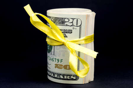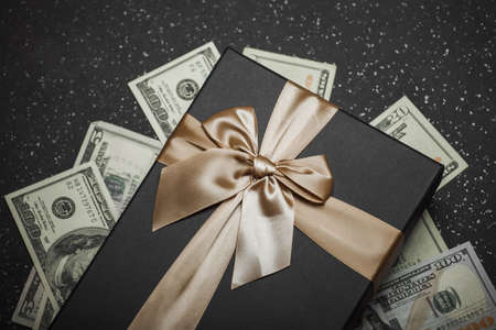 Money as a gift. A dollar bill in a box with a bow, on a black homogeneous background. Place for your text.