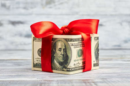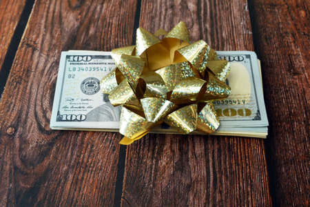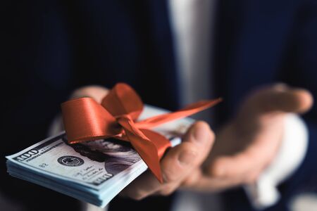Concept, money as a gift, win or bonus. businessman takes or gives pile of 100 dollar bills tied with red ribbon with bow.