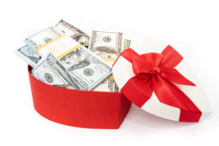 Dollars in a gift box on a white background. Valentine's Day. Birthday. Saving money.