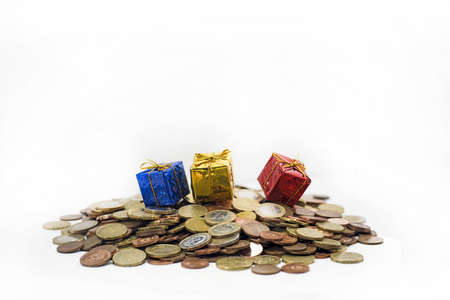 Coin climbing stairs with Christmas Holiday present, sparkling and shiny background, Finance,saving concept stacks of coins