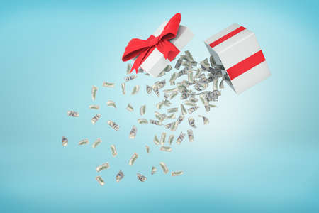 3d rendering of an overturned gift box with many dollar banknotes falling out of it.