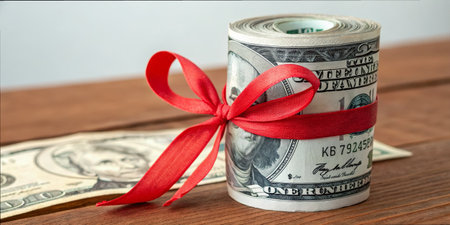 A rolled stack of money tied with a red ribbon, symbolizing a financial gift for special occasions.