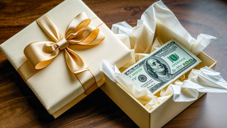 Luxurious cream-colored gift box with a golden ribbon, opened to reveal a crisp bill inside, symbolizing wealth and surprise gifting.