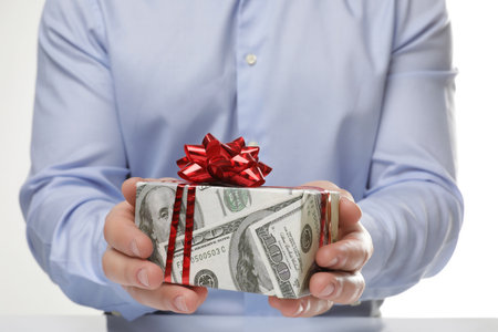 Man holding gift box wrapped in decorative paper with dollar pattern on white background, closeup
