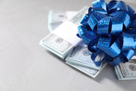 Hundred dollar bill tied with red bow on grey background. Money, gift wrapped in red bow and ribbon, US currency, cash, business success, bonus, monetary prize, luck in the game concept