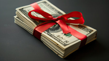 Symbolize financial success with our image of a stack of dollar banknotes adorned with a red ribbon on a pristine black background. Invest wisely