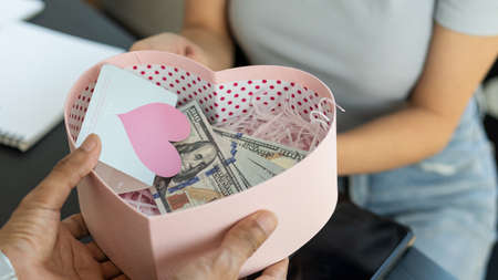 Pink heart shaped paper box with money in it as a gift for Valentine's.