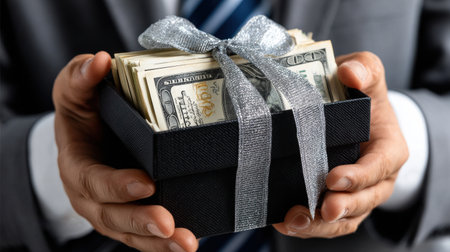 A man is holding a black box with a silver ribbon and a bunch of money inside. Concept of wealth and prosperity, as the man is holding a large amount of money in a box