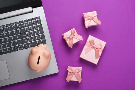 Laptop with Piggy bank and gift boxes on purple background. Minimalistic studio shot. Overhead view. Flat lay.