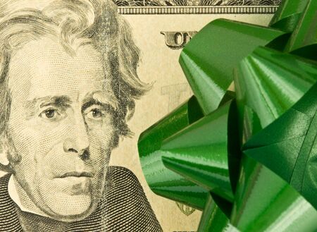 A wad of US one hundred dollar bills tied up with red ribbon over green background