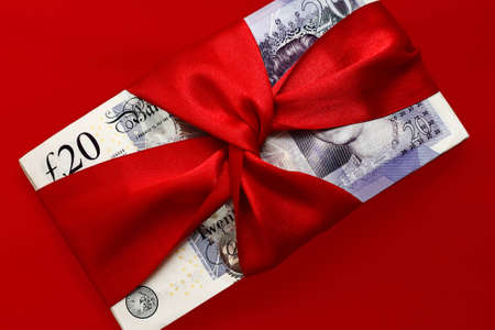 Stack of english twenty pounds notes tied with red ribbon isolated on red background