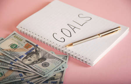 Financial goals written on page of copybook and 100 Euro bills put on it. Business and career big salary saving and investment concept ..