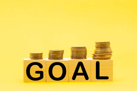 Goal on wooden cubes and stcack of coins. Target in business concept