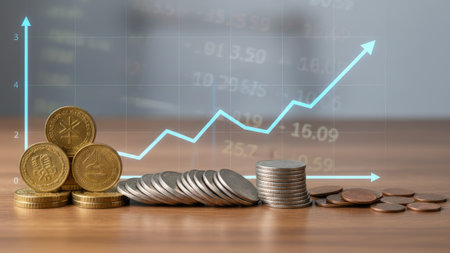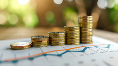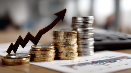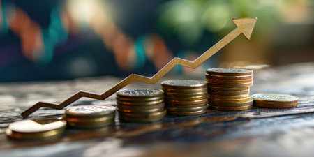 The image features stacks of coins in gold and silver hues, suggesting wealth and finance. An overlay depicts a rising trend line, implying growth. The composition is well-lit, with a shallow depth of field, suitable for financial reports or presentations. This visual could be used in business articles and investment related websites.