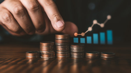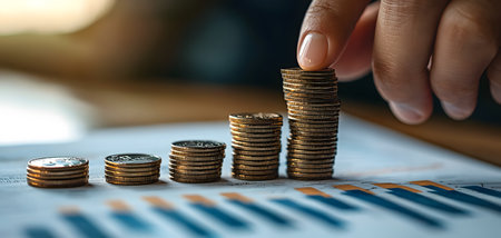 A focused hand stacks coins growing in height, symbolizing financial growth, over a chart. The background is softly blurred, enhancing the action of saving money.