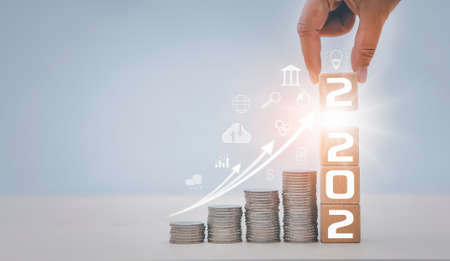 Rows of coins money with arrow up on wooden blocks, Money savings and goal planing for future, Interest rate increases, Profit from deposit money, Successful business investment