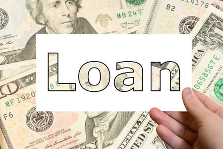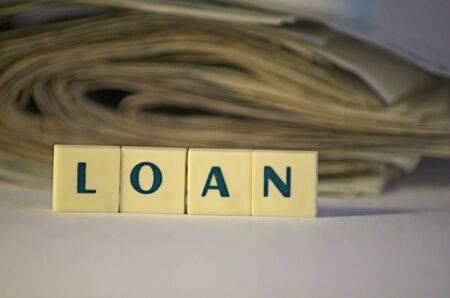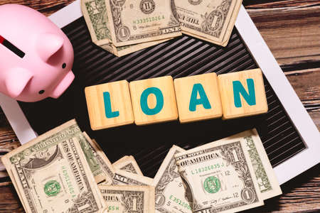 Loan inscription from a plastic cubes with blured pack of money in background