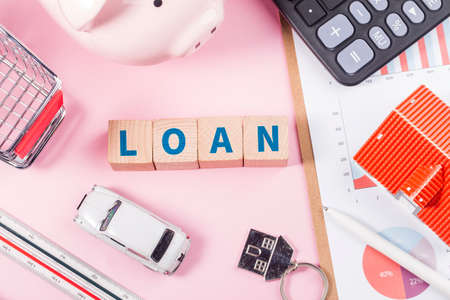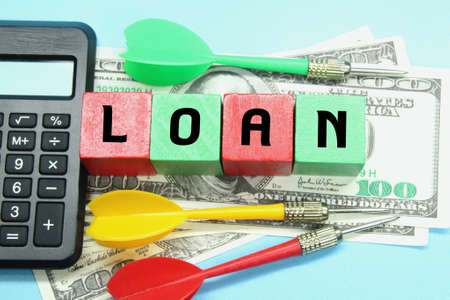 colored cubes, calculators, arrows, banknotes, with the word loan
