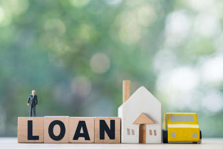 Miniature businessman stand on wood block words LOAN with wooden home and car. The concept of buying and selling real estate and car
