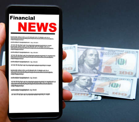 The smartphone on the screen the inscription financial news lies on dollars. 100 dollars banknotes and smartphone with financial news.