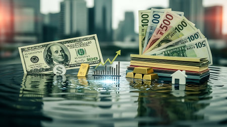 Stacks of cash and coins arranged on a reflective surface with blurred lights in the background during an evening