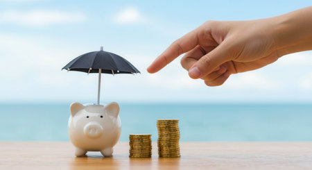 Financial protection concept with piggy bank under umbrella and stacks of coins. Hand reaching out. Saving money and investment security.