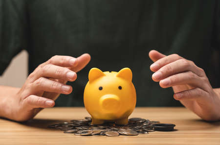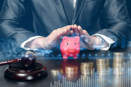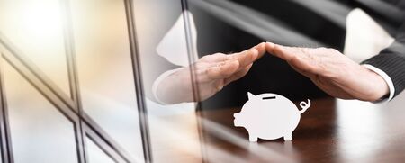 businessman protecting money with a piggy bank on the desk, financial stability management concept. Savings and pensions, collecting money, financial planning.
