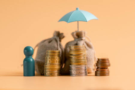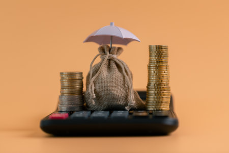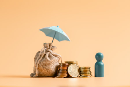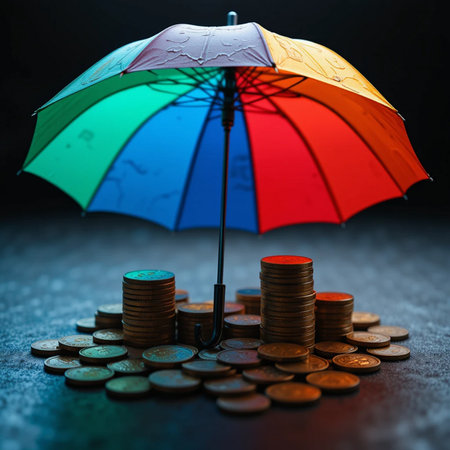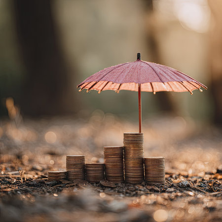 A visually compelling image illustrating an umbrella shielding a stack of coins, symbolizing financial security in a rainy environment, showcasing themes of wealth management.