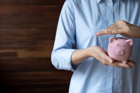 Young woman hands protection piggy bank and planning growing saving to strategy with pile coins for future plan fund of travel, education, home and retirement.