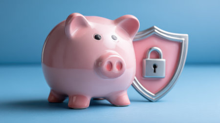 Piggy bank with a shield and lock icon behind it, symbolizing financial security, data protection, and safe investments