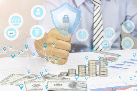 businessman protecting money, financial stability management concept. Savings and pensions, collecting money, financial planning