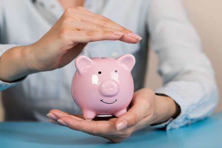 Man saving piggy bank with his hands. Concept of Finance, crisis and saving money