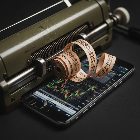 A modern office setup featuring a laptop, smartphone displaying a stock chart, financial documents, and a coffee cup on a white desk.