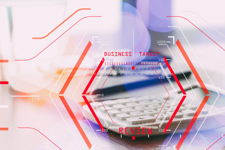 Multi exposure of virtual creative financial chart hologram on blurry calculator background, research and analytics concept
