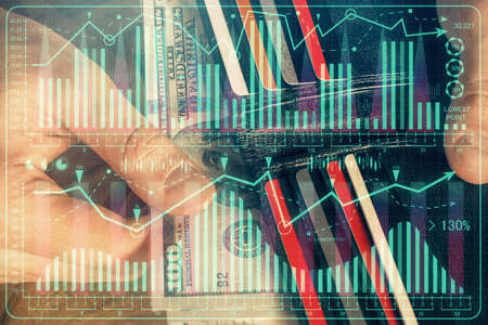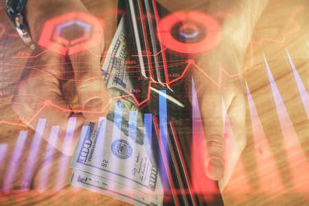 Multi exposure of forex graph drawing hologram and USA dollars bills and man hands. Technical Analysis concept.