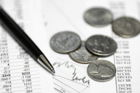 Close up of accounting figure, pen and coins on paper.