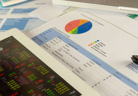 Finance savings concept, business equipment on paperwork. Financial analysis - income balance statement