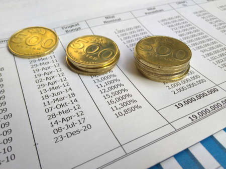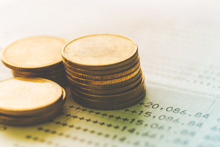 A stack of coins placed on a financial report with a blurred background. Represents finance, savings, investment, and business growth.